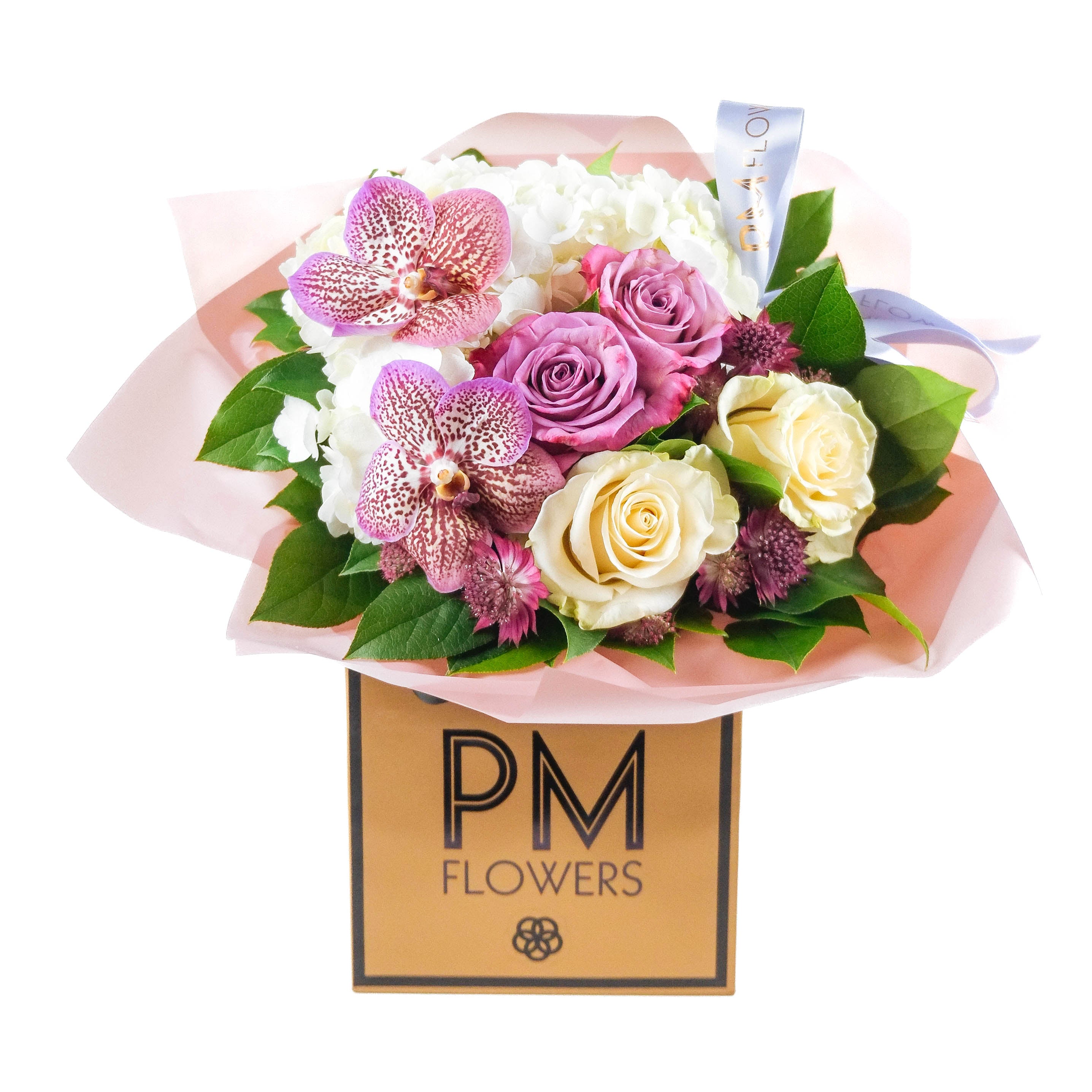 استمتع بأناقة باقة "لمسة من الأناقة" الخاصة بنا، وهي مجموعة مذهلة مصممة لإبهار الجميع. تتميز هذه الباقة الفاخرة بمزيج متطور من زهور الكوبية البيضاء والأسترانتيا والورود الفاخرة كبيرة الرأس باللون الأبيض الكلاسيكي وظلال البنفسجي الساحر.
