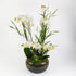 ارتقِ بمساحتك مع أوركيد اليشم، حيث تلتقي الأزهار البيضاء الهادئة بدرجات اليشم الغنية في الوعاء. هذا التشكيل هو مثالٌ للأناقة الراقية، يضفي لمسةً هادئةً وفاخرةً على أي غرفة.
