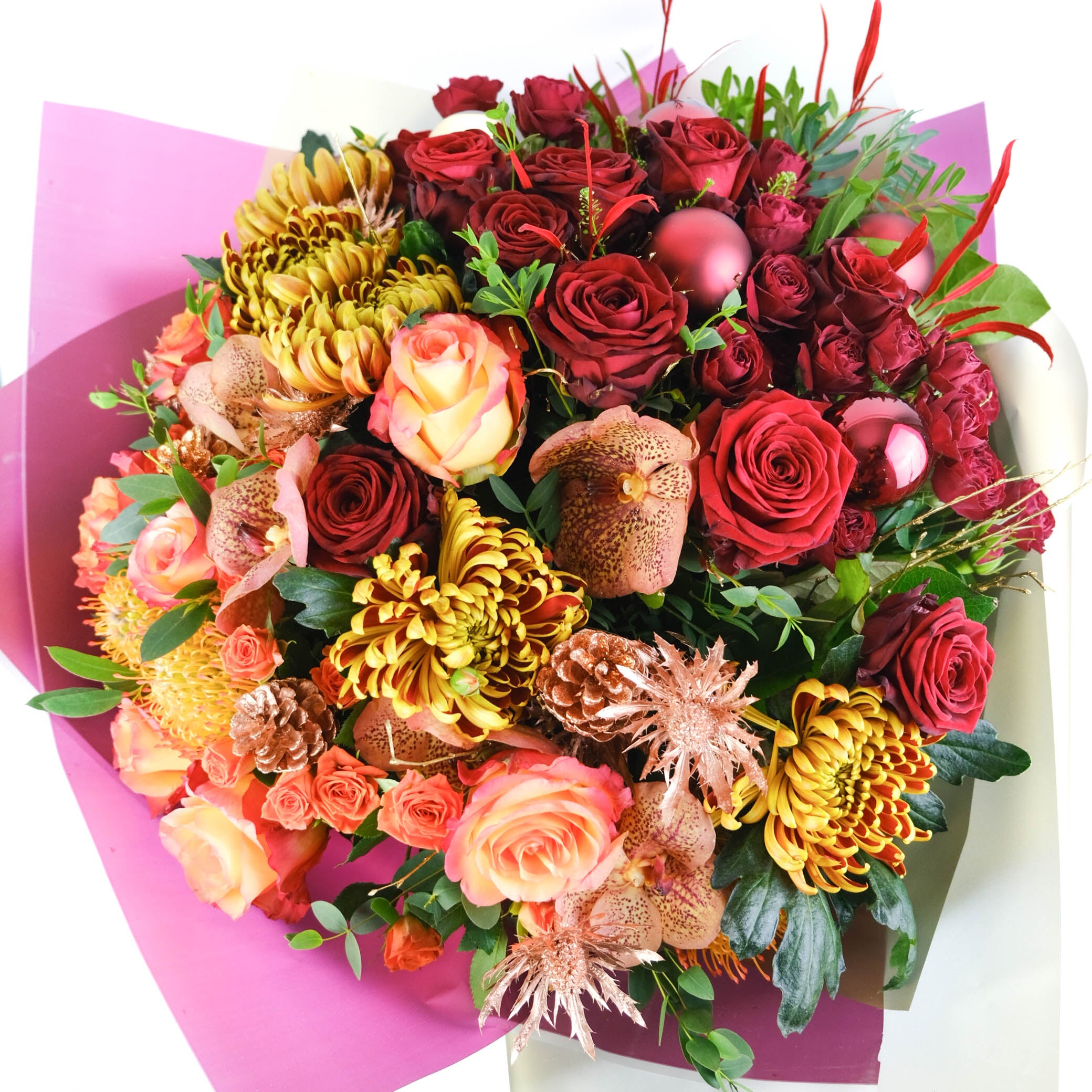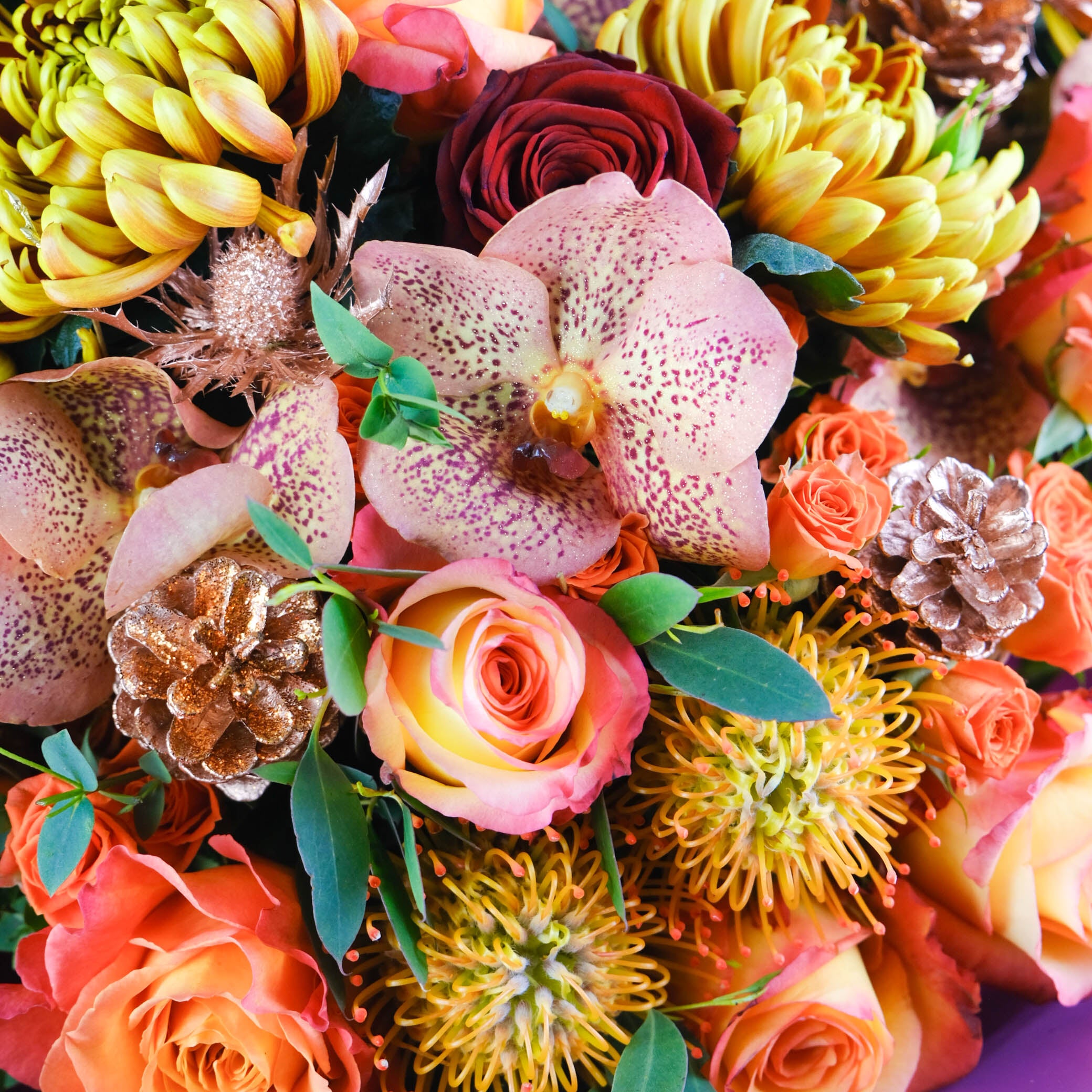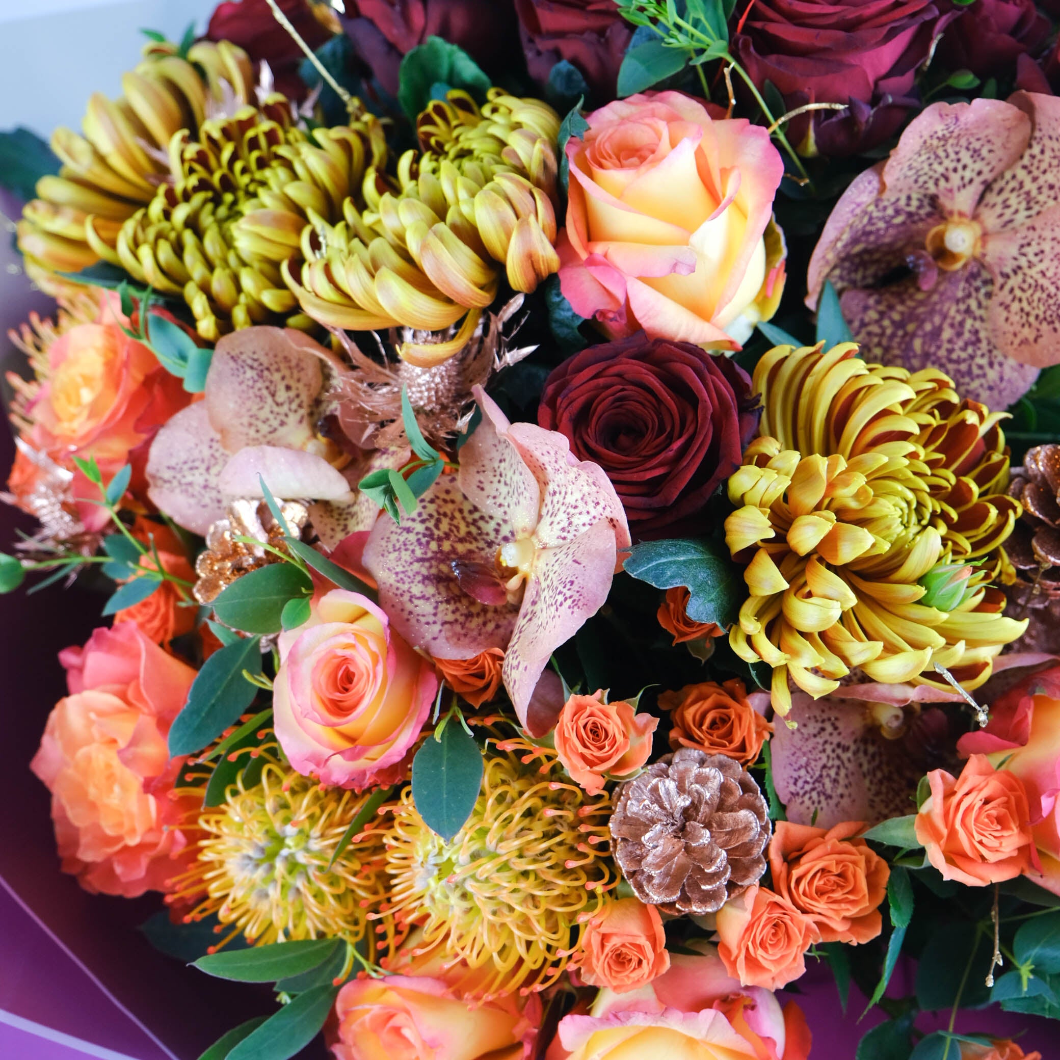 نقدم لك باقة Abigail الفاخرة بدرجات اللون البرتقالي والخوخي والشمبانيا الدافئة. تتميز هذه الباقة ذات الحجم الكبير بأزهار الكوبية وورود الخوخ وورود الرش والأوركيد والليزيانثوس والجرس الأخضر والكارثاموس والجريفيليا والأقحوان، وكلها مزينة بشكل جميل بأوراق الشجر التكميلية. تضيف لمسة رقيقة من الذوق الخريفي عمقًا وثراءً لهذه الباقة المذهلة.