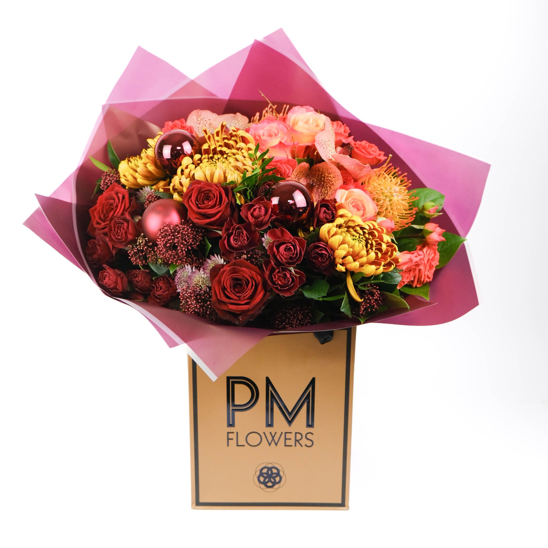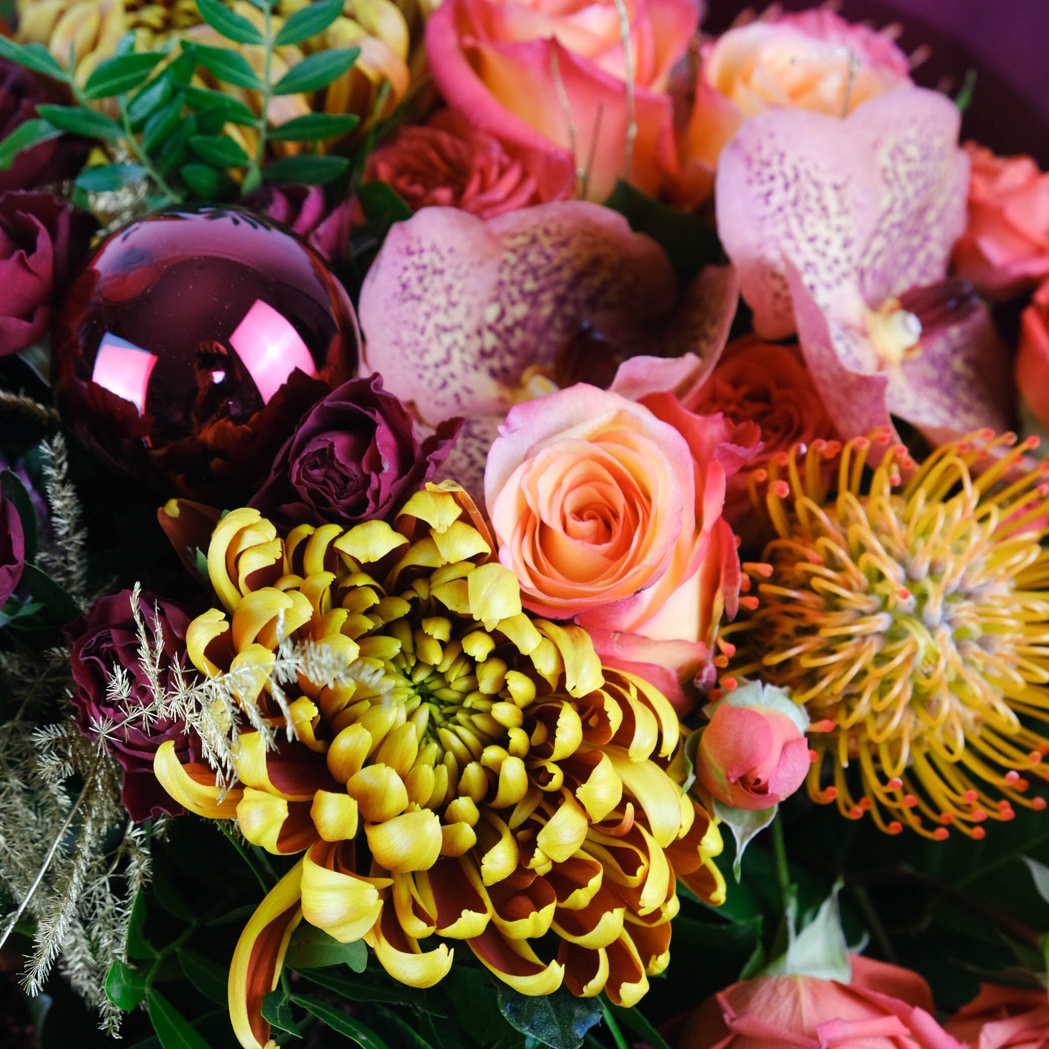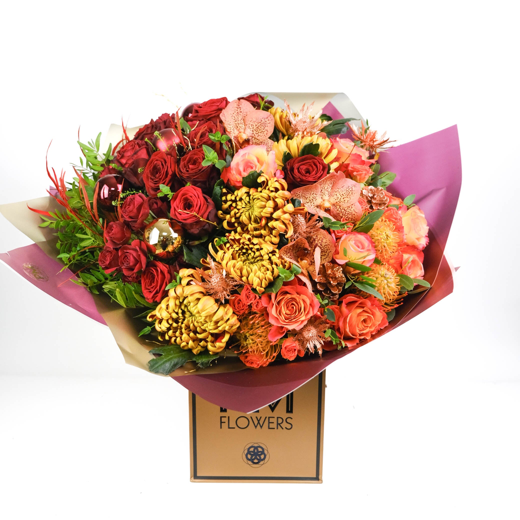 نقدم لك باقة Abigail الفاخرة بدرجات اللون البرتقالي والخوخي والشمبانيا الدافئة. تتميز هذه الباقة ذات الحجم الكبير بأزهار الكوبية وورود الخوخ وورود الرش والأوركيد والليزيانثوس والجرس الأخضر والكارثاموس والجريفيليا والأقحوان، وكلها مزينة بشكل جميل بأوراق الشجر التكميلية. تضيف لمسة رقيقة من الذوق الخريفي عمقًا وثراءً لهذه الباقة المذهلة.