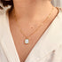 A delicate bevelled edge pendant with a mother of pearl centre. Necklace chain is a lightweight curb chain with a compressed detail that catches the light.